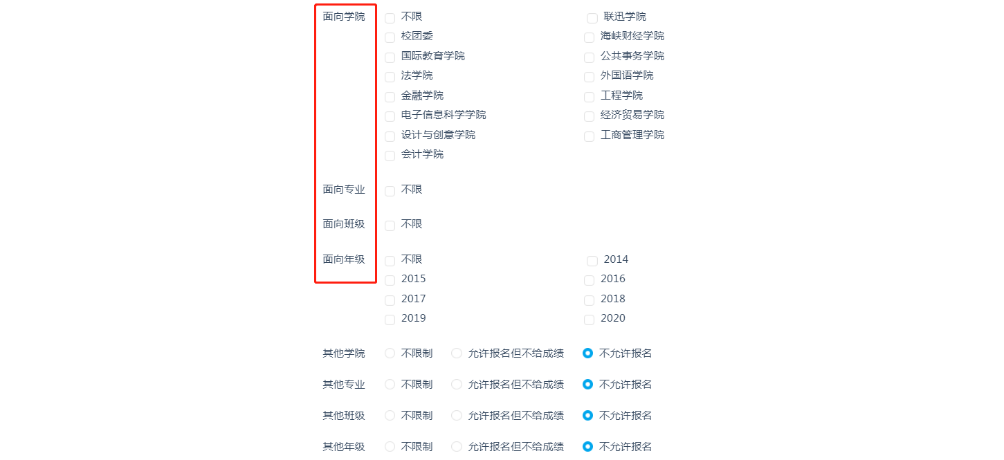 面向学院,可点击选择不限或可对所有学院进行选择。